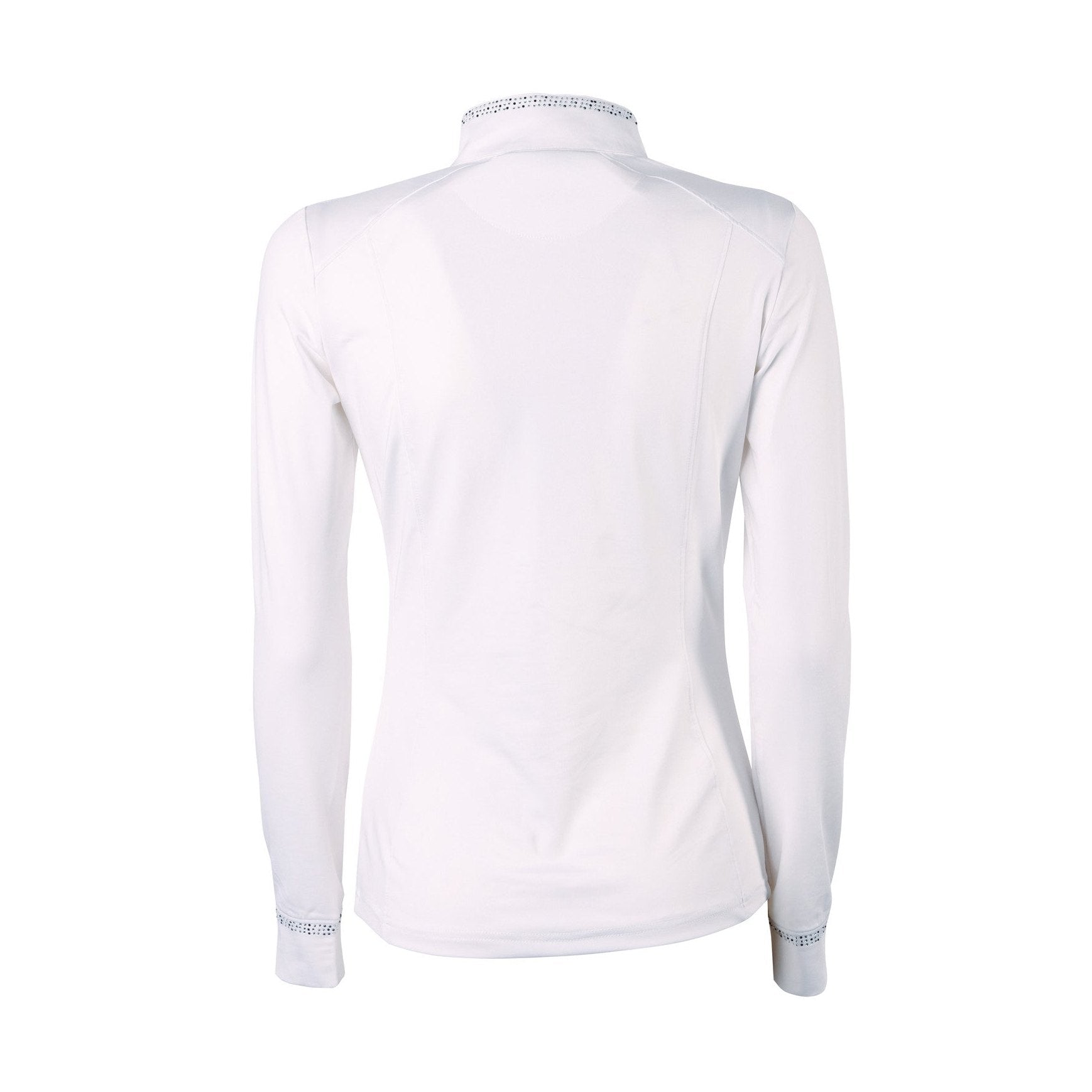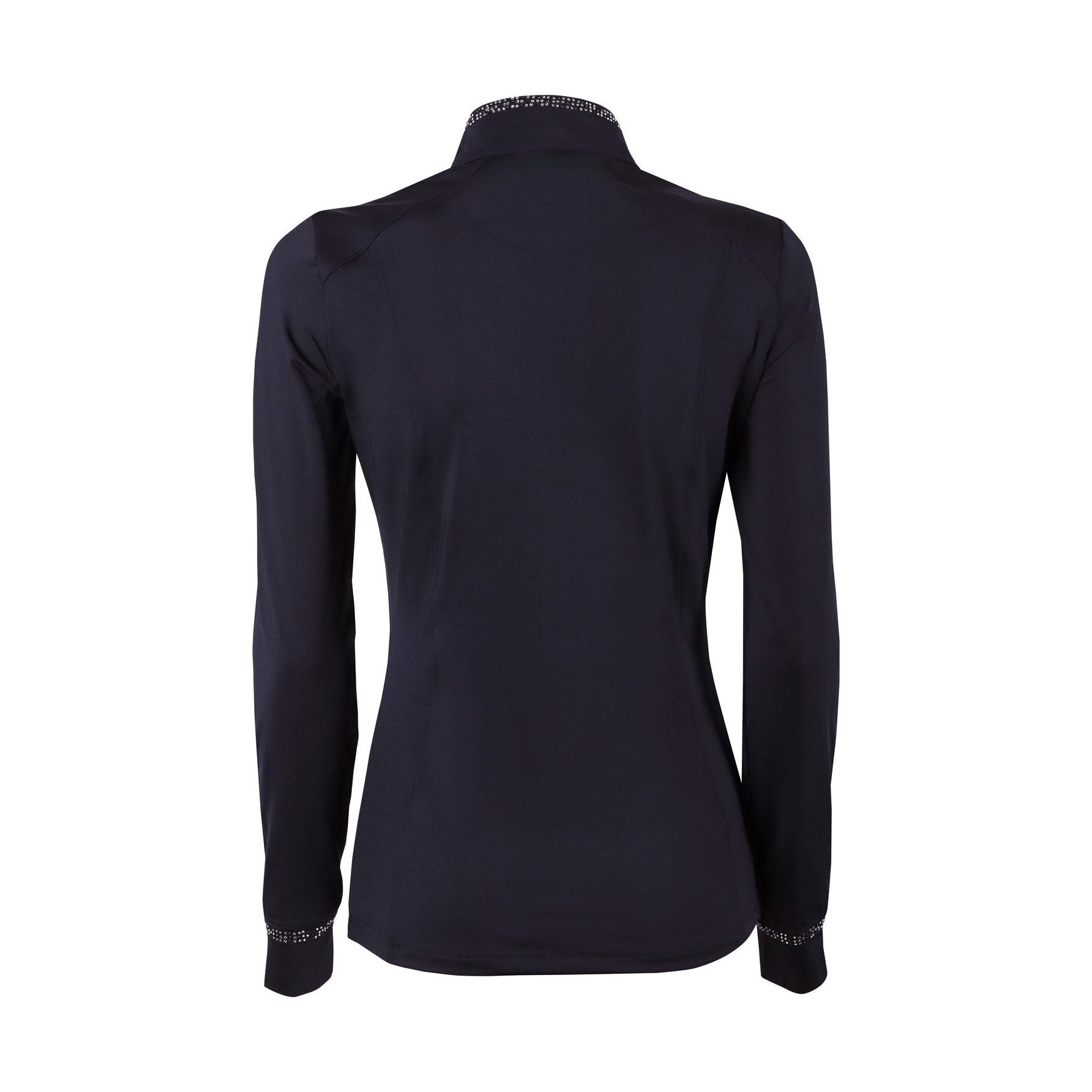 Turniershirt mit langen Ärmeln und Stehkragen mit kurzem Reißverschluss. Kragen und Manschetten sind rundum mit Kristallen verziert.