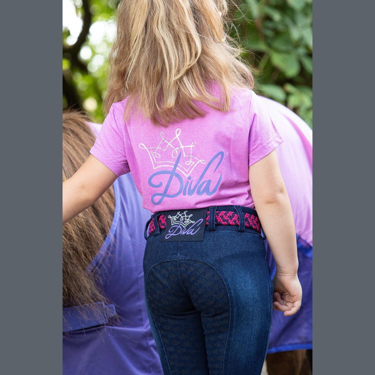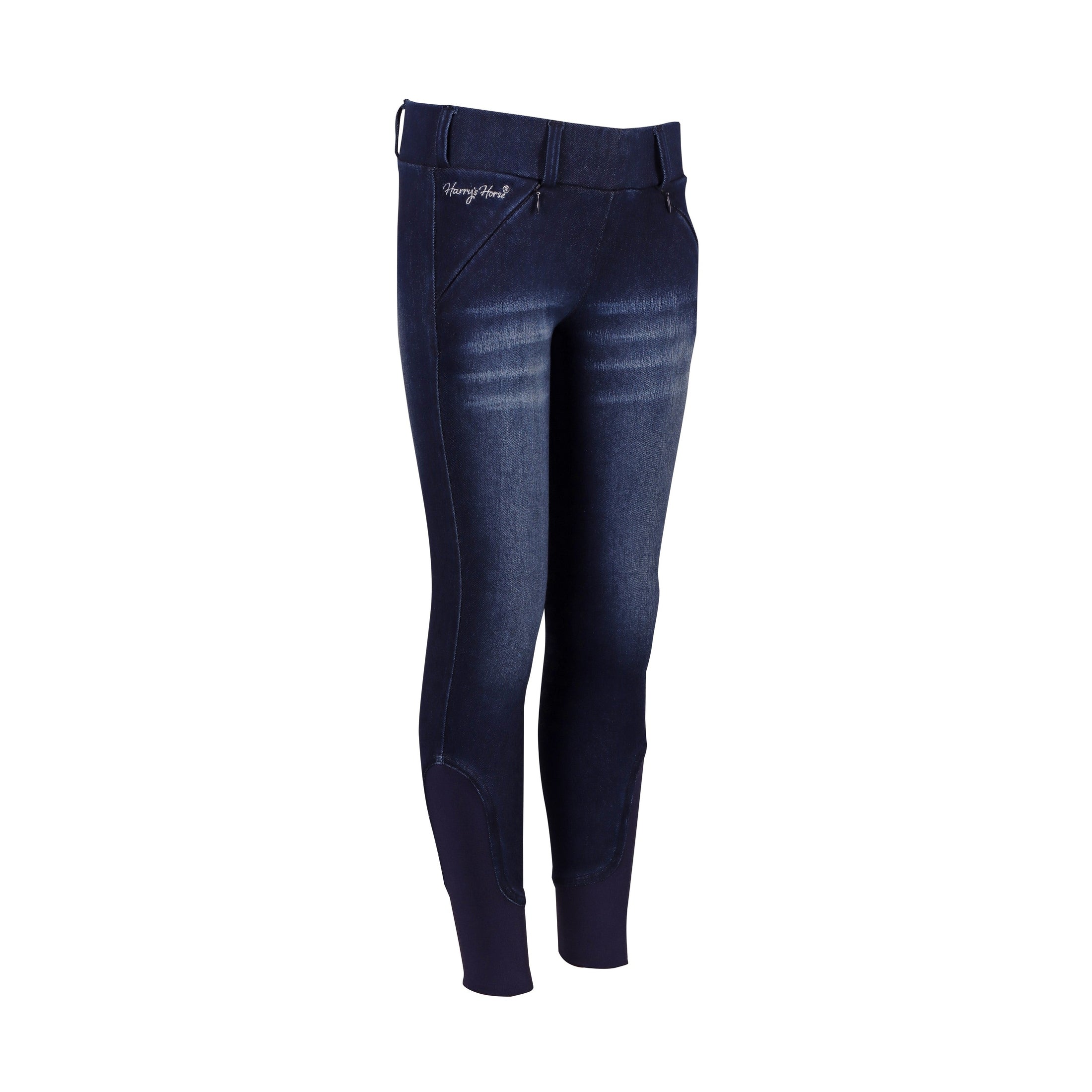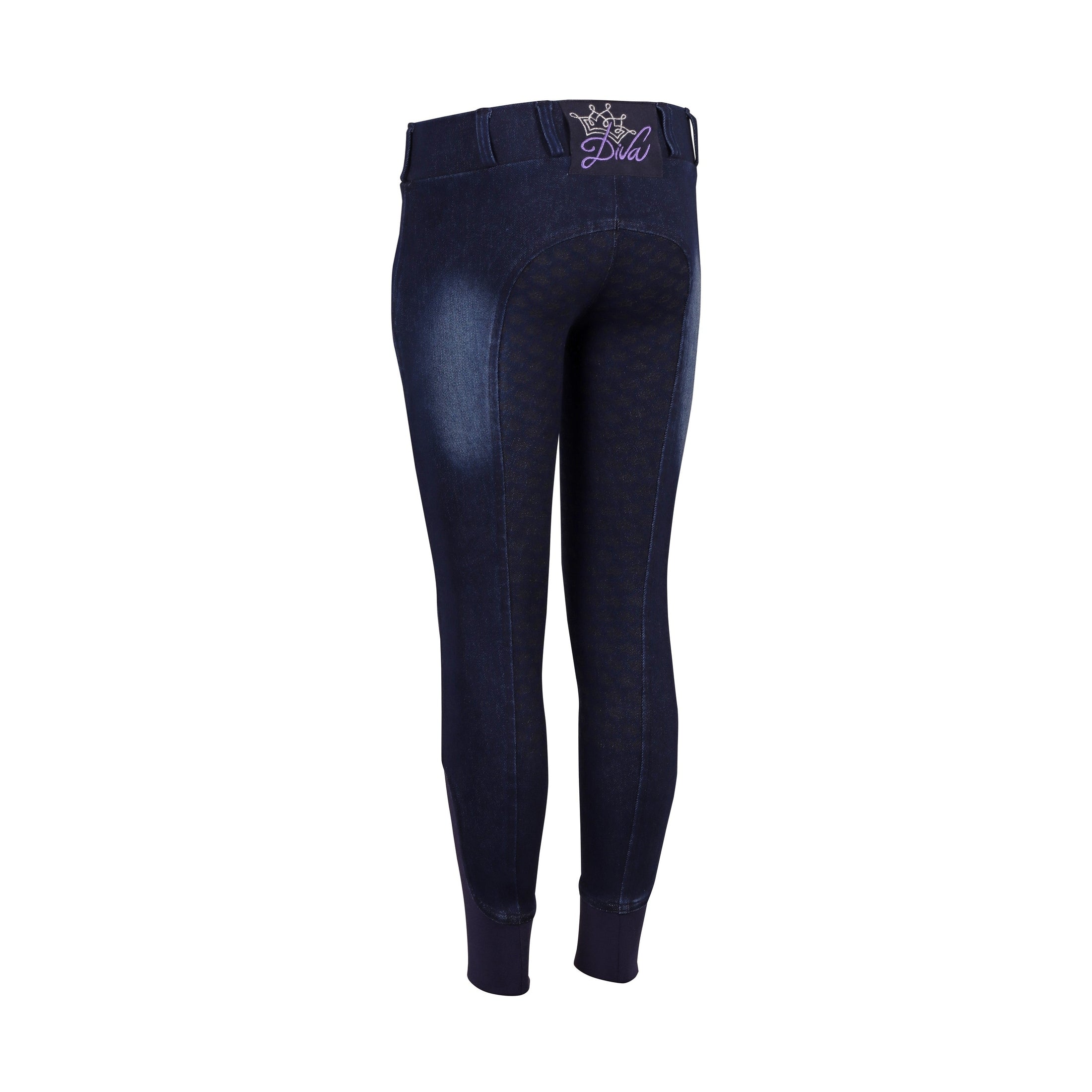 Reitleggings im Denim-Look mit lustiger Waschung und Diva-Logos, einem Badge am Bund, Gürtelschlaufen, zwei Taschen, einem rundgenähten Gesäß mit Silikondruck und einem elastischen Einsatz am Knöchel für mehr Komfort in den Reitstiefeln.