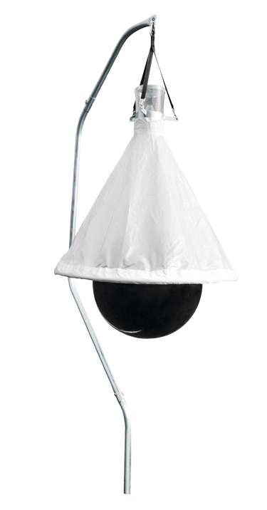 Die Bremsenfalle fängt Bremsen, indem sie die weiblichen Bremsen in die Irre führt. Der schwarze Ball wird von der Sonne erwärmt und bewegt sich im Wind leicht hin und her.
