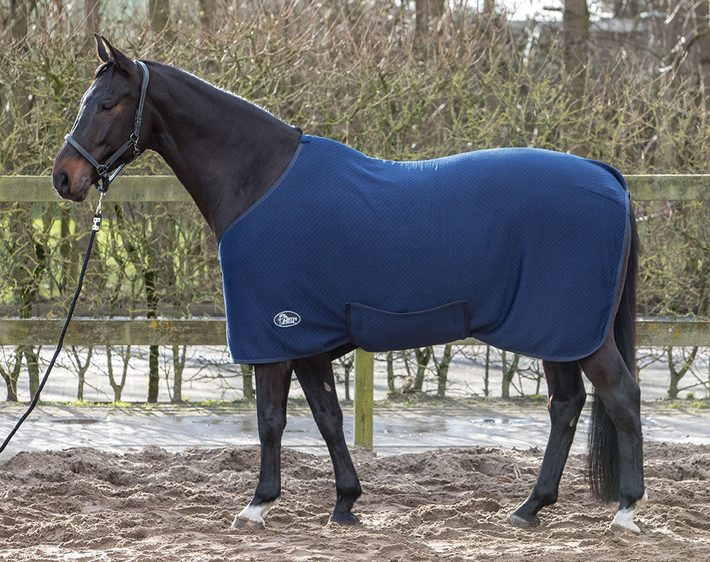 Comfortabele onderdeken van hoogwaardig polyviscose materiaal met polyfill padding. Deze deken heeft thermoregulerende eigenschappen waardoor je paard het, ondanks het dunne materiaal, aangenaam warm heeft onder zijn deken. Door de gesloten voorkant en brede buikflap zonder gespen/singels (sluit dmv klittenband) heeft het paard minder last van vervelende druk en wrijving dan met een normale onderdeken. Met staartlus.