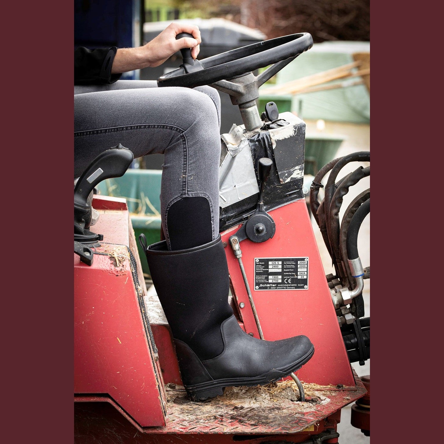 Botte d'extérieur imperméable. Le pied est en cuir et la tige en néoprène. La botte est dotée d'une semelle souple en TPR et l'intérieur est doublé d'une membrane imperméable.