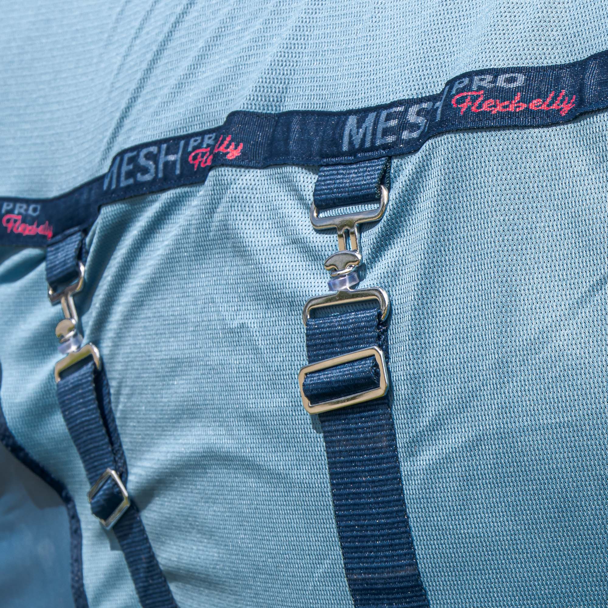 Couverture Mesh-pro à utiliser comme couverture anti-mouches ou couverture rafraîchissante, dotée d'une double fermeture avant, d'un cou fixe avec trois fermetures et d'une doublure pour protéger la crinière, le tour de ventre, un rabat de queue extra large et une boucle de queue, poitrine doublée en polyester.