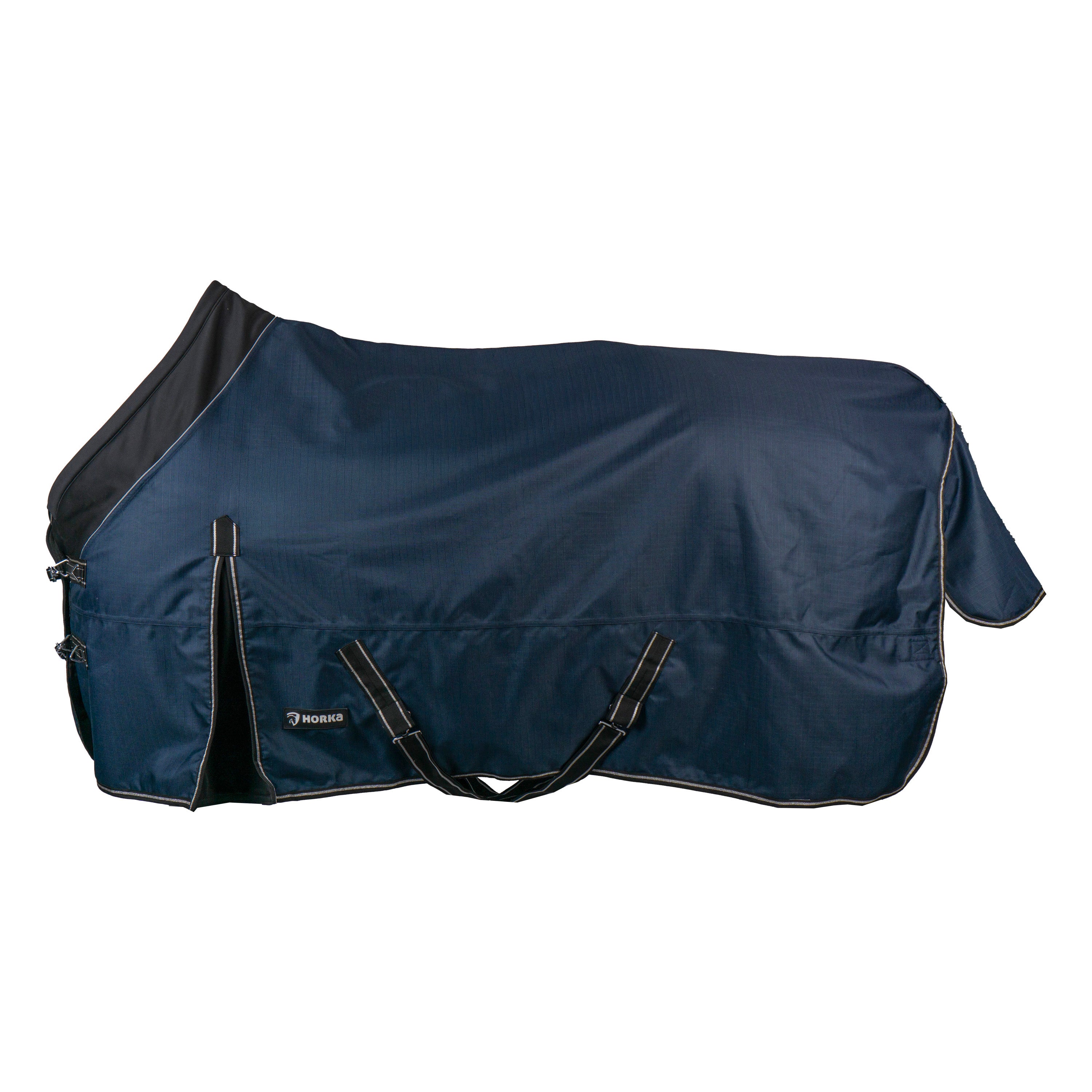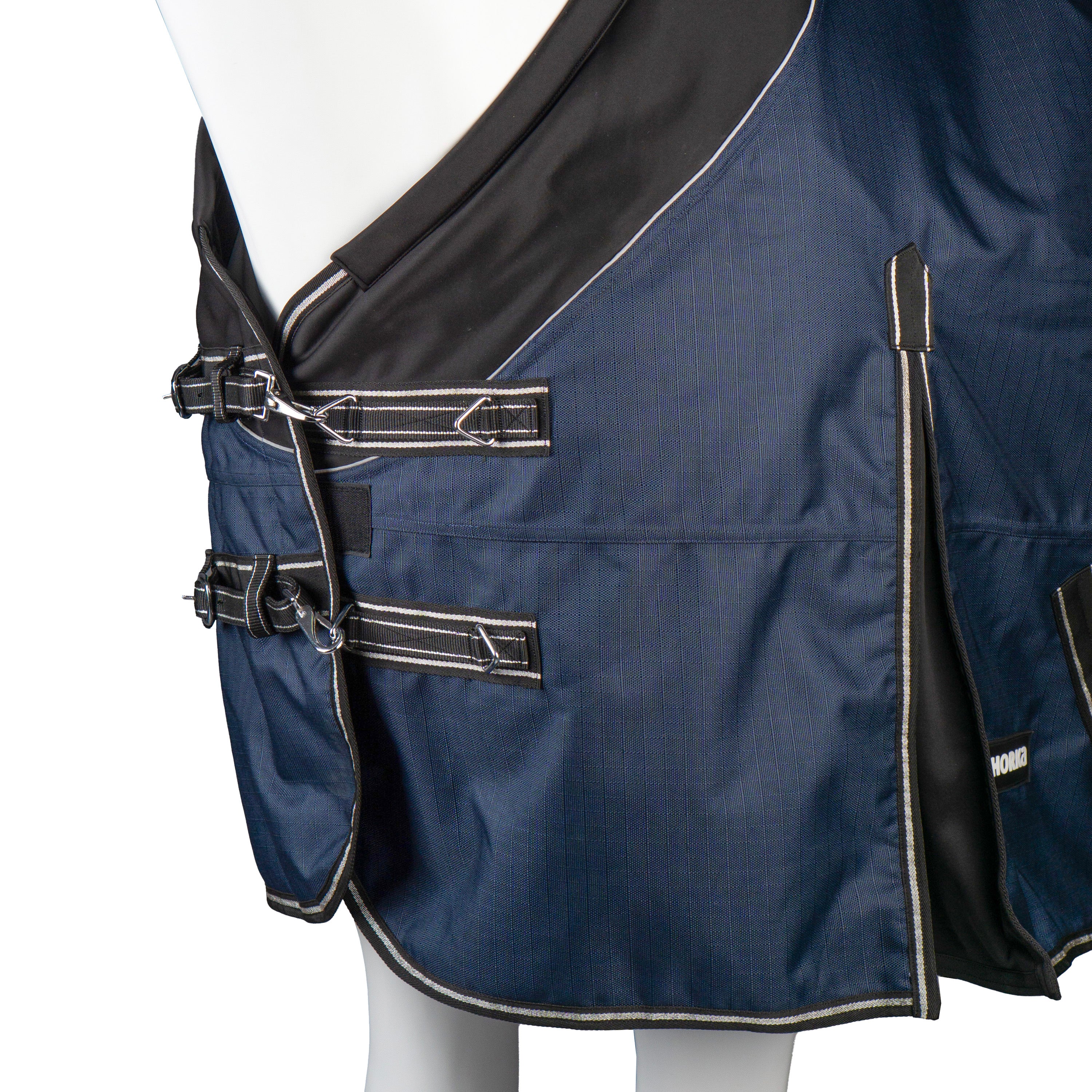 Couverture d'extérieur résistante avec un col souple et rembourré pour un confort optimal. Équipée d'une protection de garrot de 100 g, d'une double fermeture de poitrail, de sangles croisées et de sangles de cuisses amovibles. Caractéristiques : polyester ripstop 1200D, imperméable 3000 mm et respirant 3000 mvp, rembourrage 100 g, doublure en polyester. Double fermeture de poitrail réglable par boutons-pression et velcro. Sangles croisées avec extrémités élastiques et butées en caoutchouc. Cordon de queue élastique avec bordure en PVC et 2 clips. Protection de garrot :