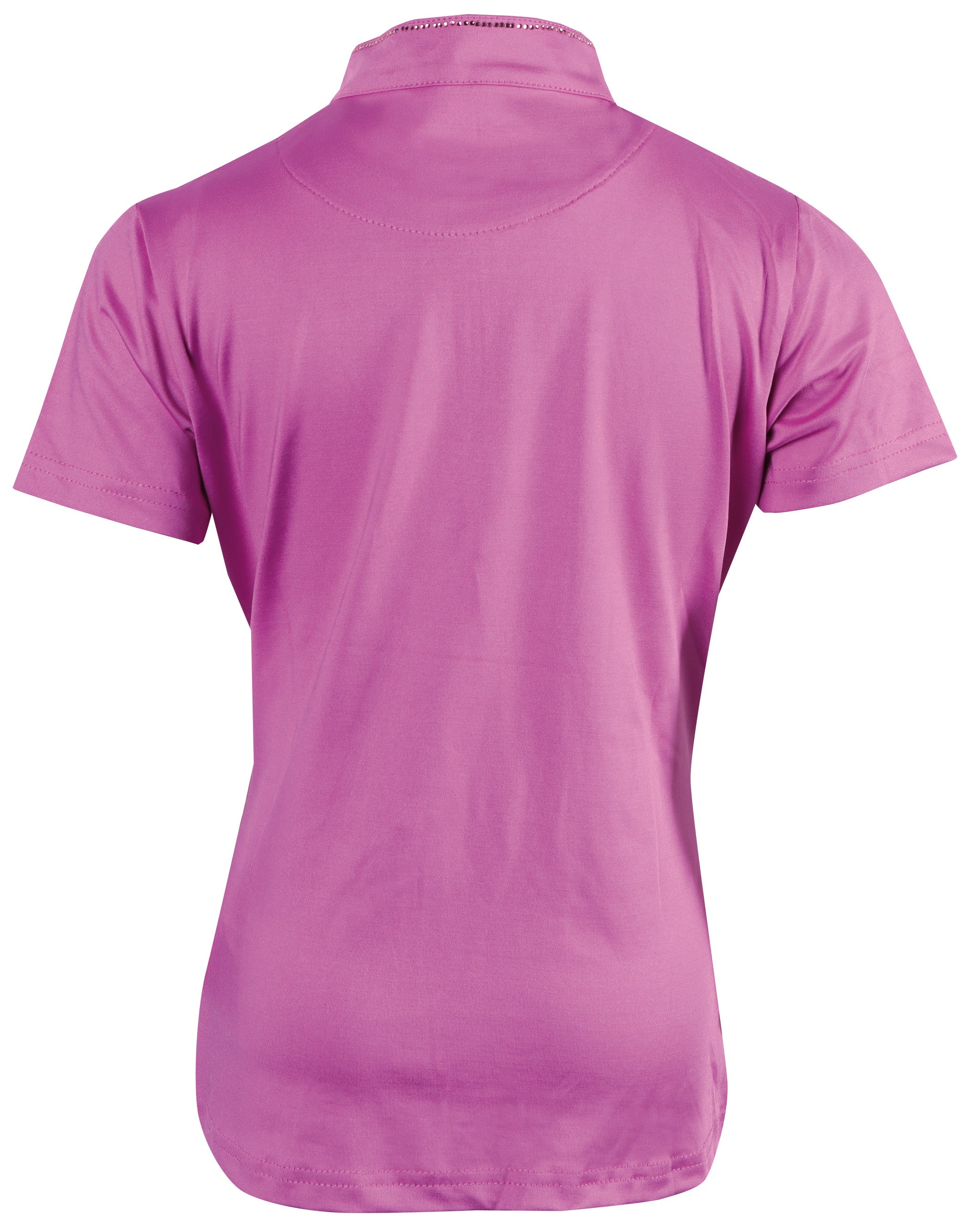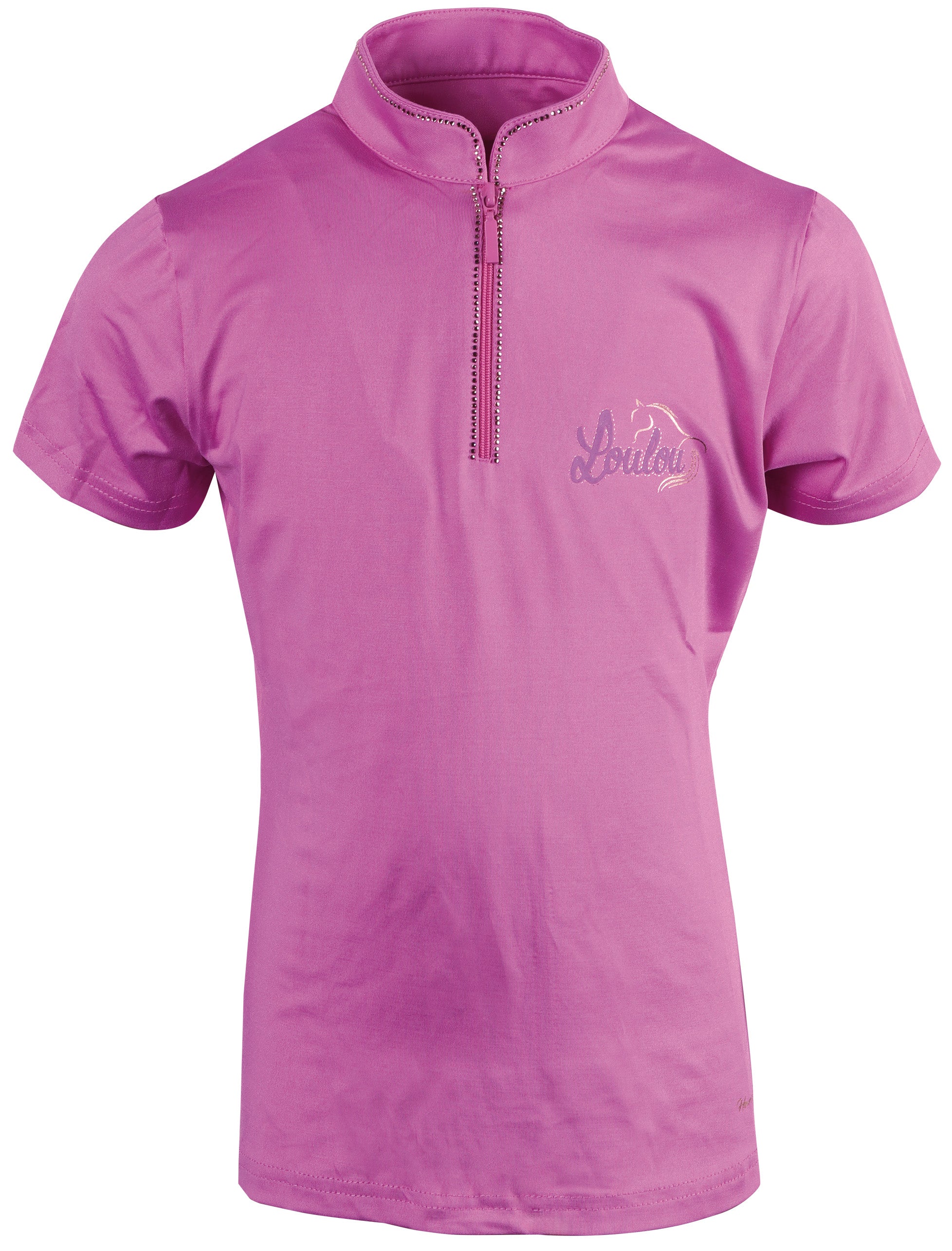 Kurzärmeliges Hemd mit Stehkragen und kurzem Reißverschluss, umgeben von Kristallen, LouLou-Logo auf der linken Brust.