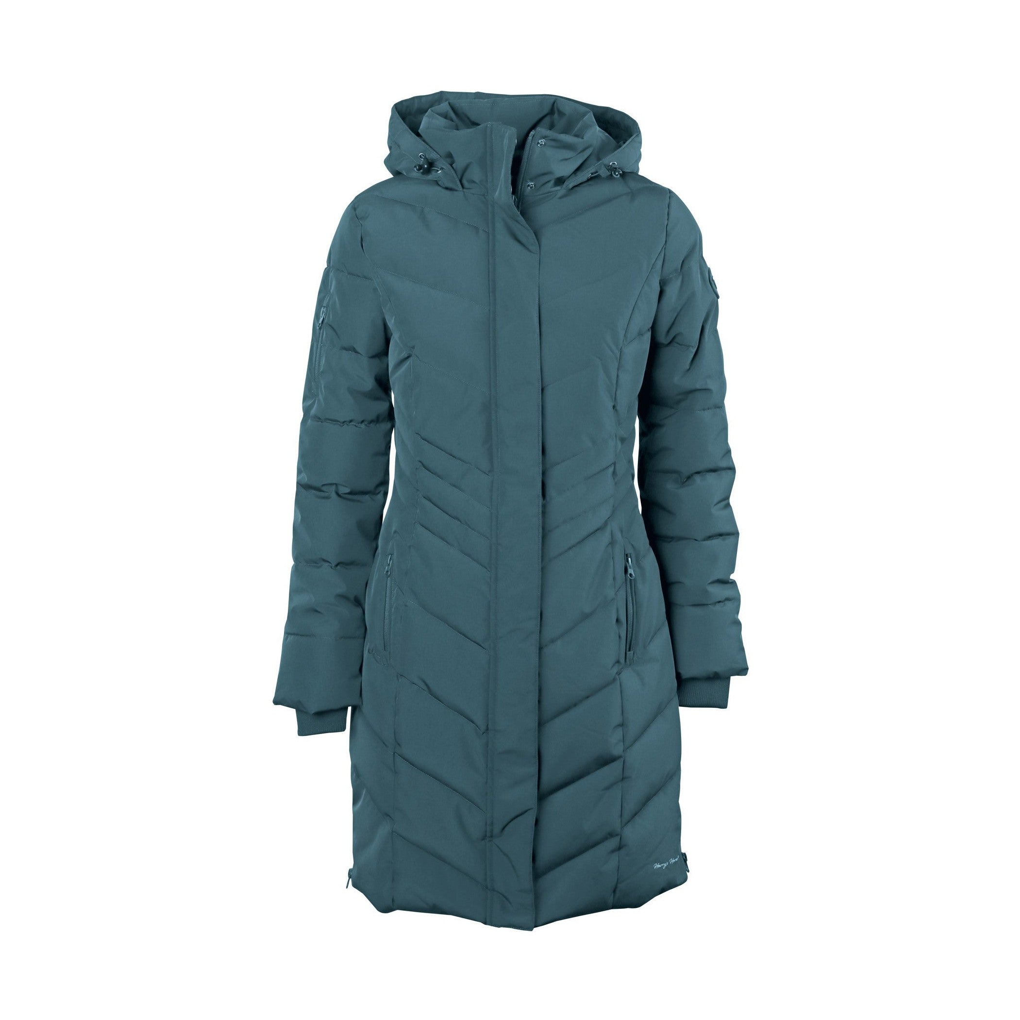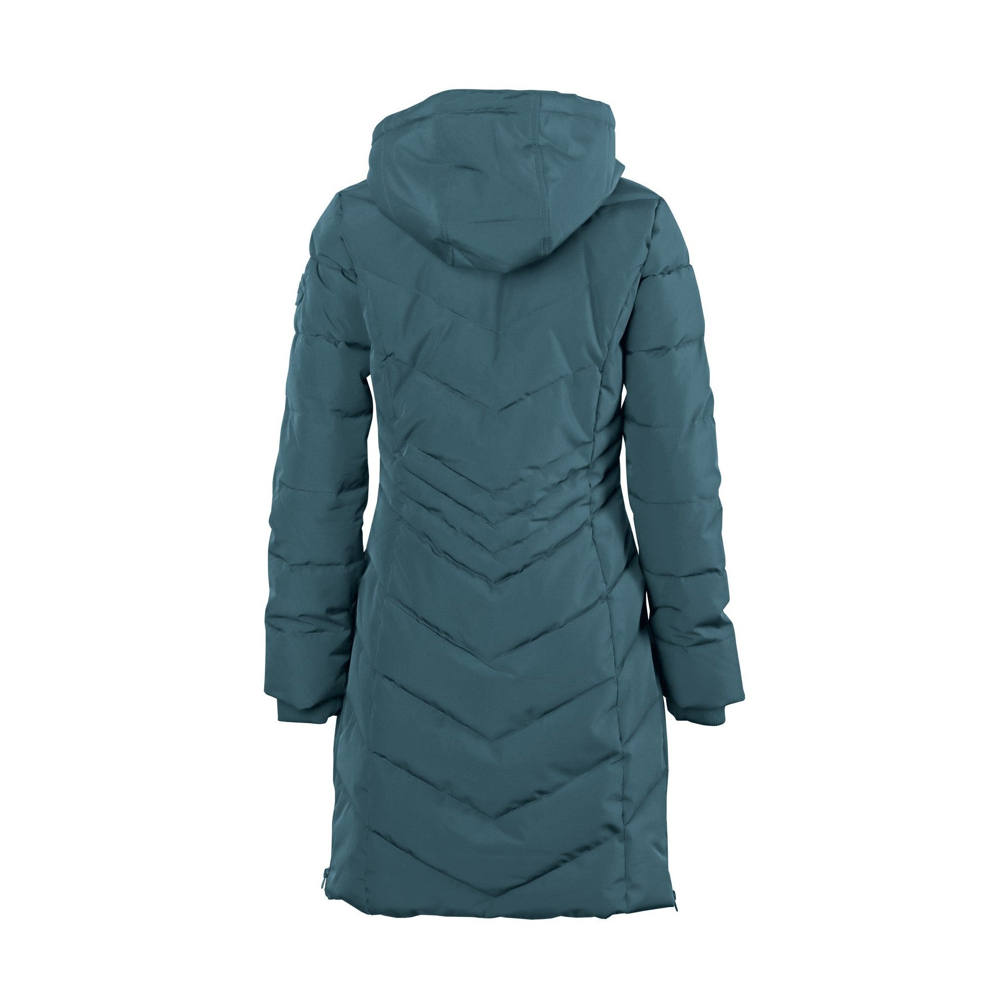Lange, wasserabweisende Jacke mit Zwei-Wege-Reißverschluss und Druckknöpfen, zwei Reißverschlusstaschen, zwei langen Reißverschlüssen an den Seiten mit einer darunterliegenden Abdeckung zum Schutz vor Regen und einer Aufhängeschlaufe.