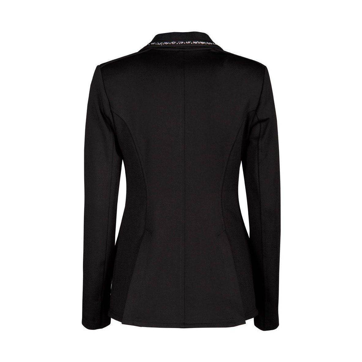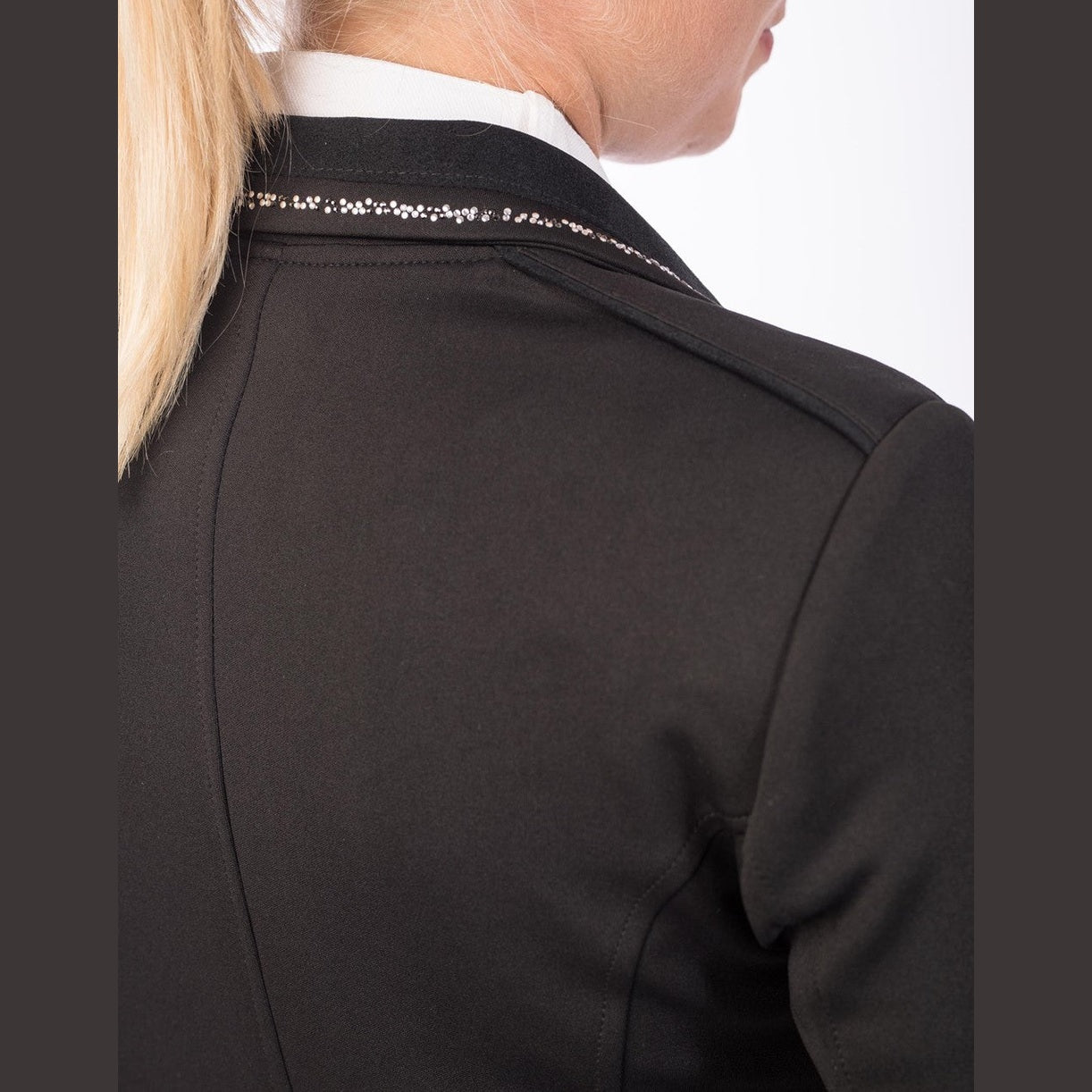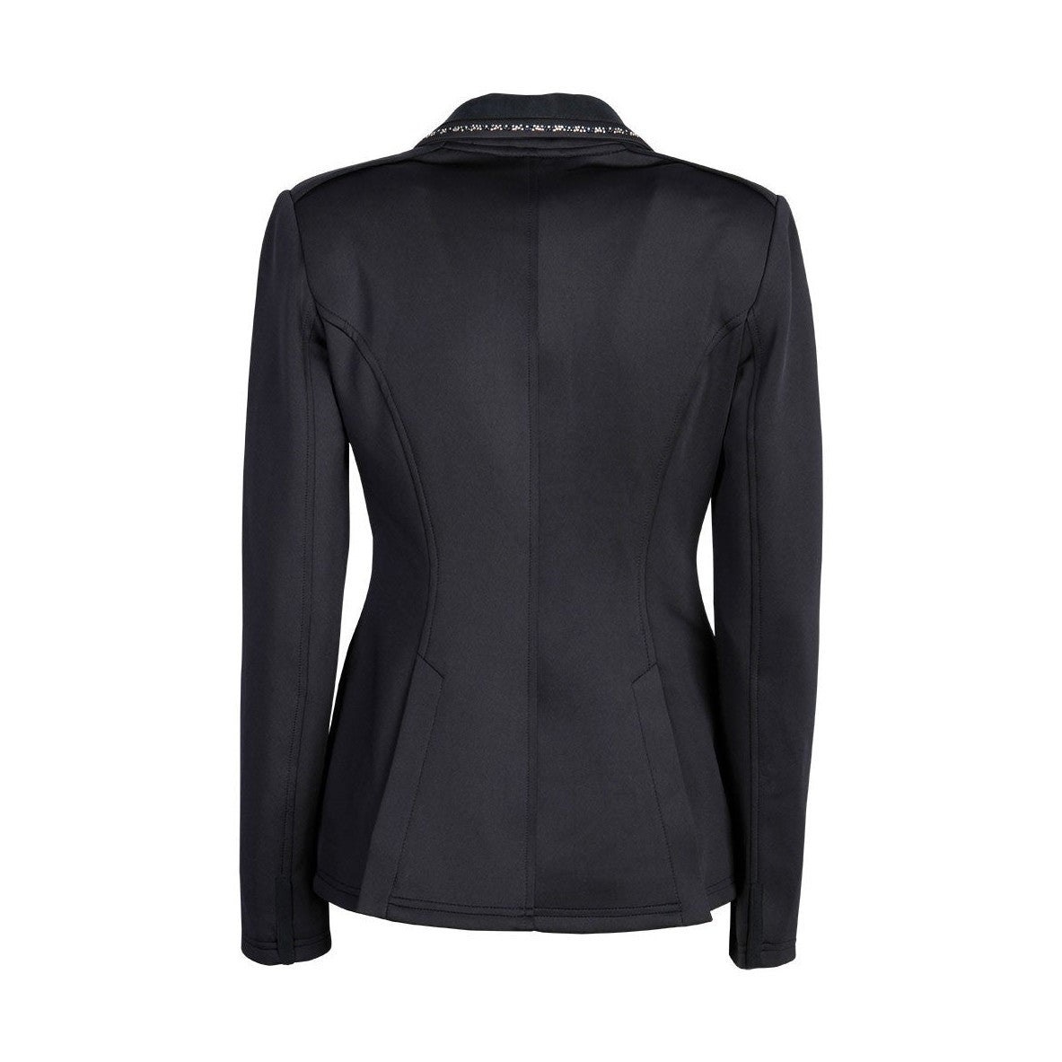 Modernes Turniersakko aus hochwertigen Stretchmaterialien. Das Sakko ist mit kleinen Kristallen am Kragen und den Leistentaschen ausgestattet, die ebenfalls über einen verdeckten Reißverschluss verfügen. Ein Reißverschluss auf der Vorderseite kombiniert mit einem Knopfverschluss.