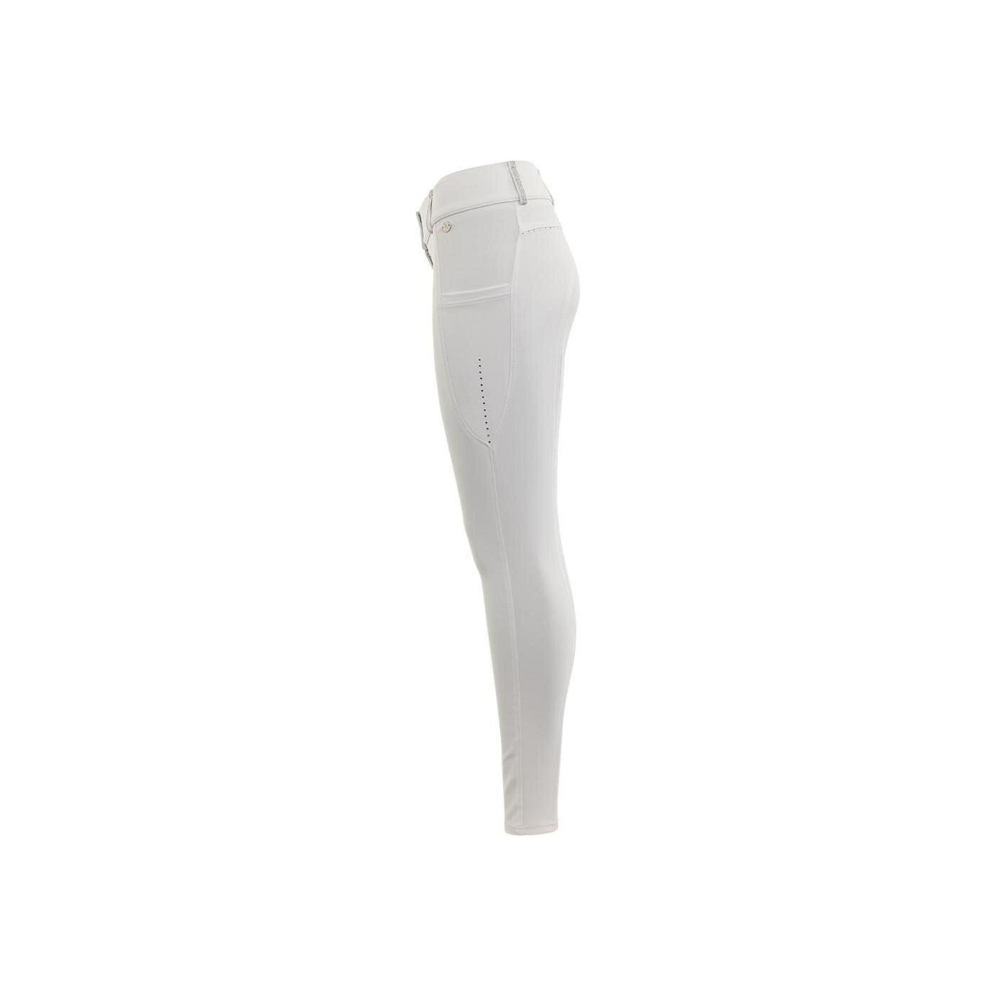 Rijbroek Cancun heeft een hoge tailleband met drie haak-en oogsluitingen en zilveren glitterbanden op de riemlussen. De broek is voorzien van twee diepe zijzakken geschikt voor het wegstoppen van een mobiele telefoon en een verborgen ritszak aan de rechter voorzijde. Het siliconen zitvlak maximaliseert de stabiliteit op het zadel. De elegante afwerking met imitatiediamanten op de voor-en achterzijde geeft de broek een luxe uitstraling.