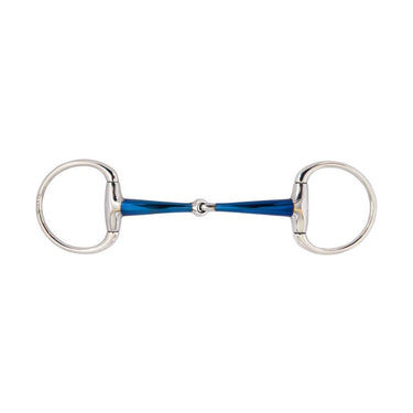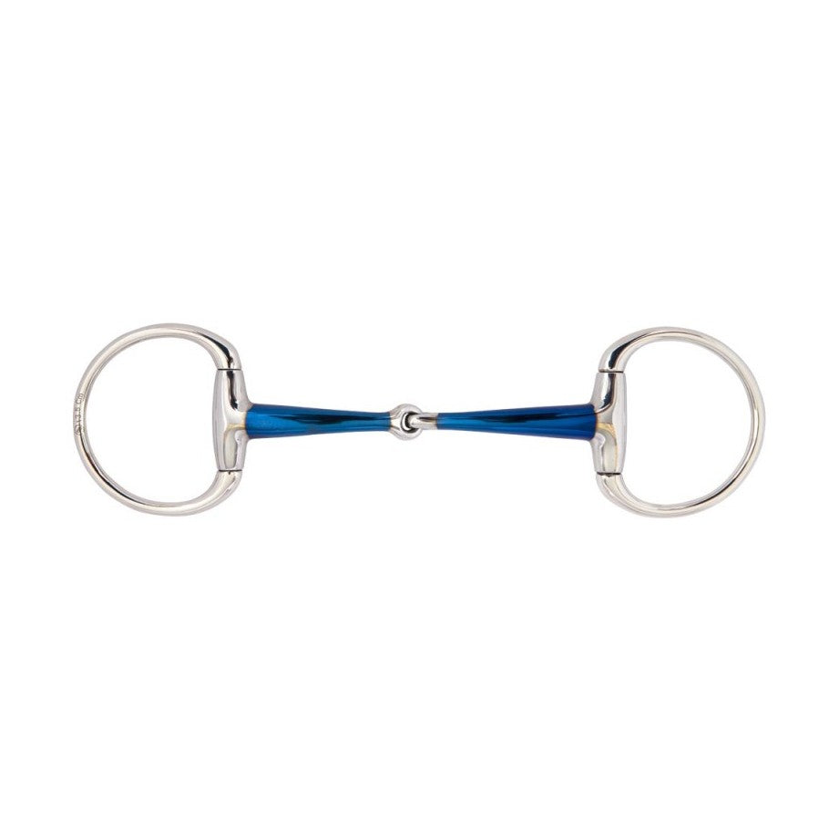 Dieses einfach gebrochene Wassertrense ist aus massiven Edelstahlringen und einem weichen Stahlmundstück gefertigt, kombiniert mit einer Sweet Iron Schicht auf dem Mundstück (blau). Die Sweet Iron Beschichtung auf dem Mundstück fördert die Speichelproduktion. Wenn dieses Material mit Feuchtigkeit, Wärme und Luft reagiert, oxidiert es und entwickelt einen süß schmeckenden Oberflächenrost. Dies hilft bei der Akzeptanz des Gebisses. Schließlich verschwindet die blaue Farbe, aber der Geschmack des Oberflächenrostes bleibt.