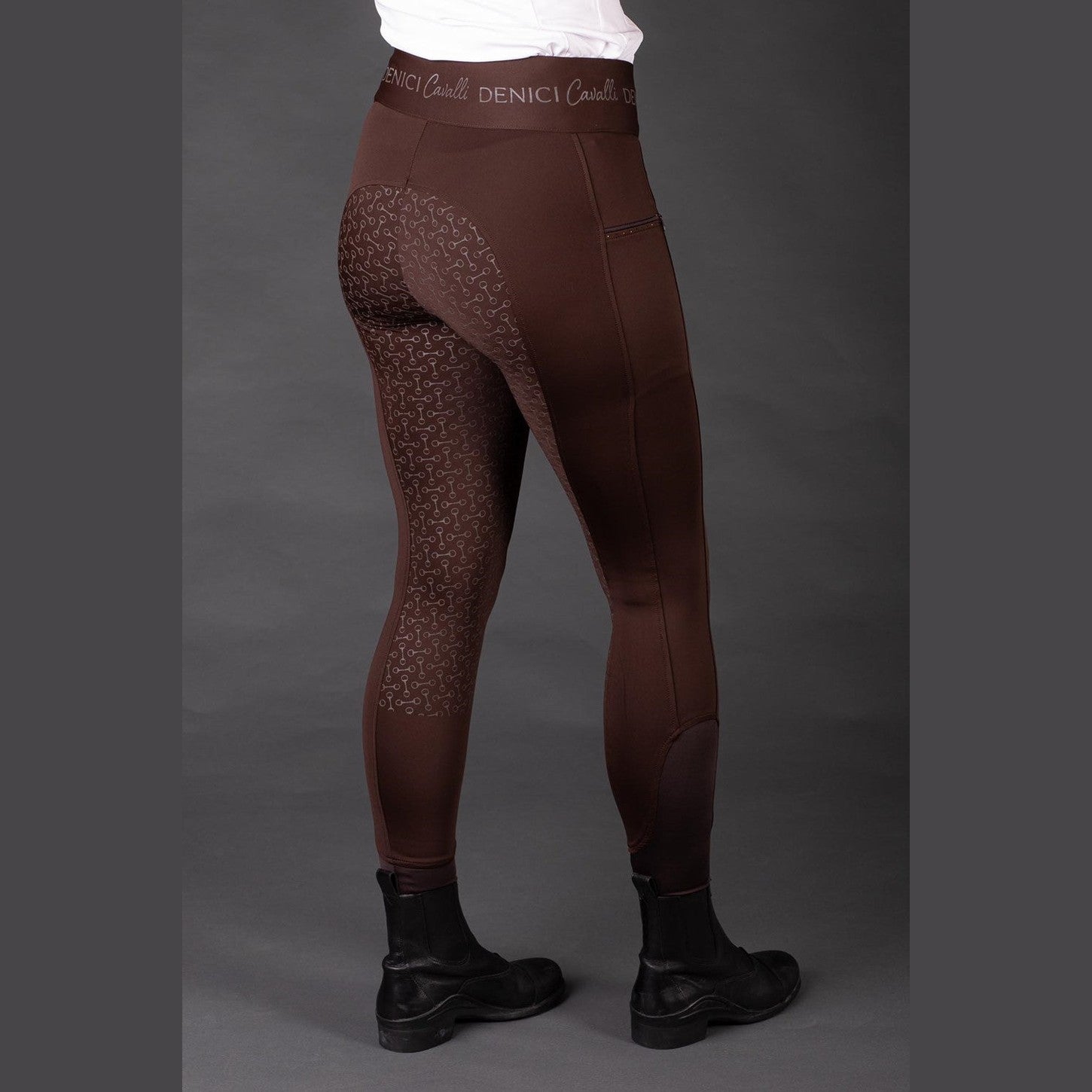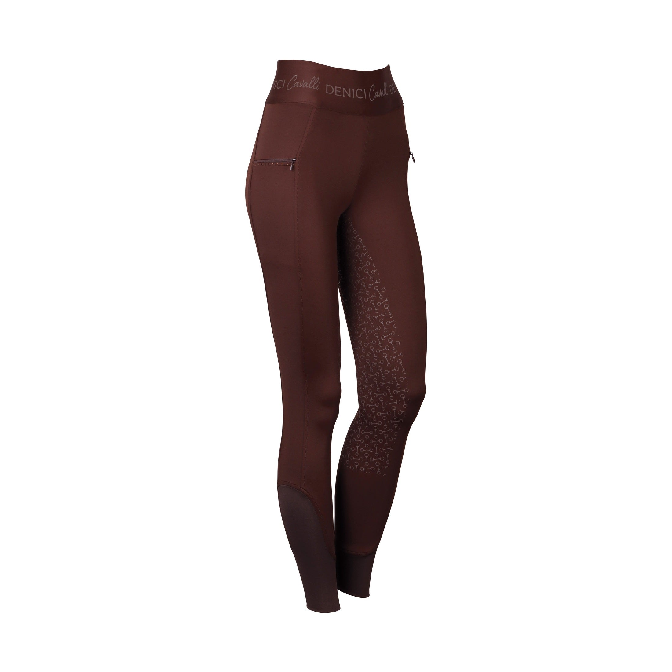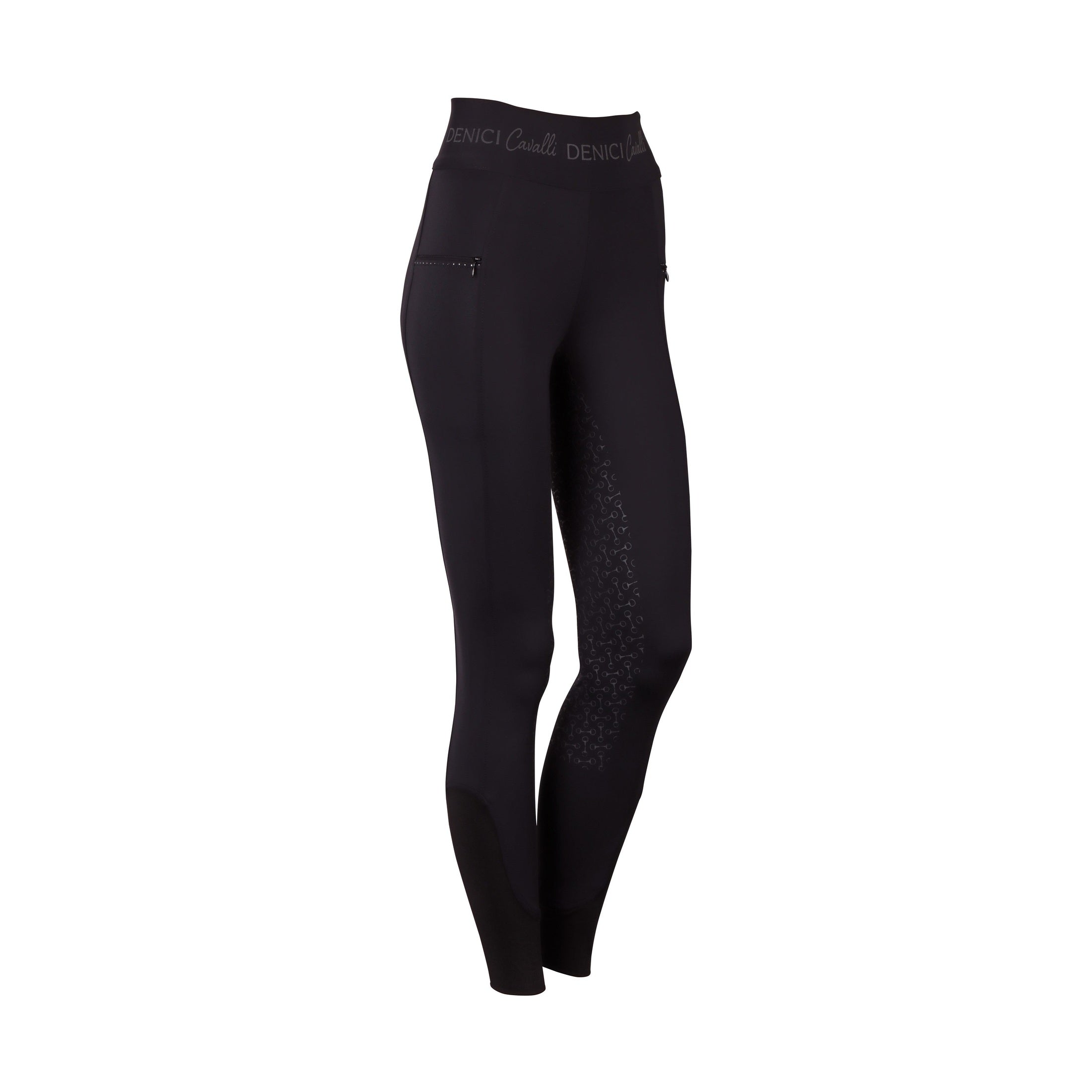 Reitleggings mit zwei Reißverschlusstaschen, Kristallen und Paspeln, einem Ton-in-Ton-Denici-Cavalli-Aufdruck auf dem gesamten Hosenbund, Gesäß mit Silikonaufdruck für zusätzlichen Halt im Sattel und mit einem elastischen Einsatz um die Knöchel.